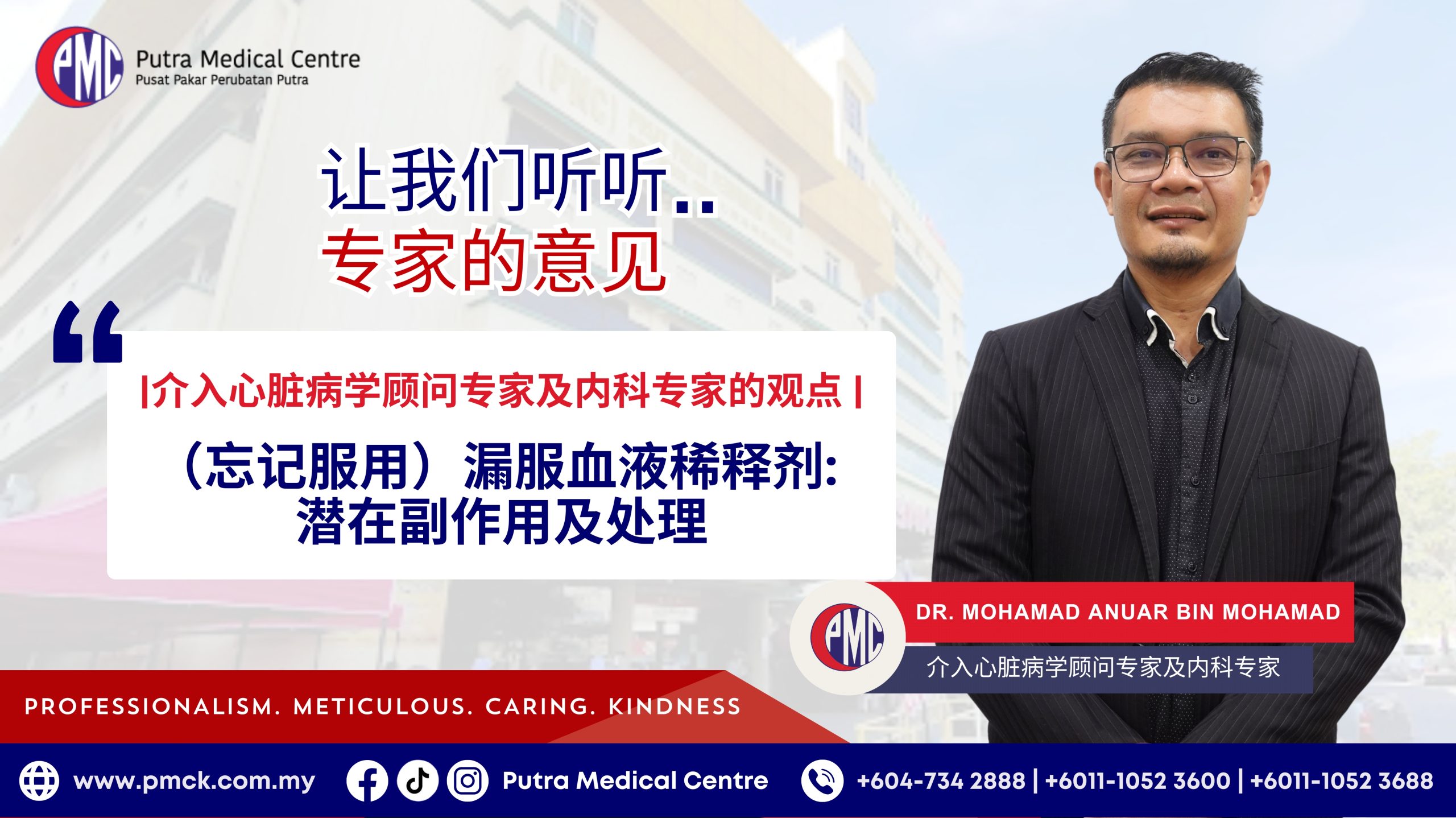 在本期刊中,Putra Medical Centre Alor Setar’s 驻院顾问医师兼介入心脏病专家——退役上校莫哈末安瓦尔·宾·莫哈末博士 (Col. (R) Dr. Mohamad Anuar bin Mohamad) 深入探讨了漏服抗凝血药物可能引发的潜在危害,并指导患者如何安全管理用药计划以获得最佳治疗效果。