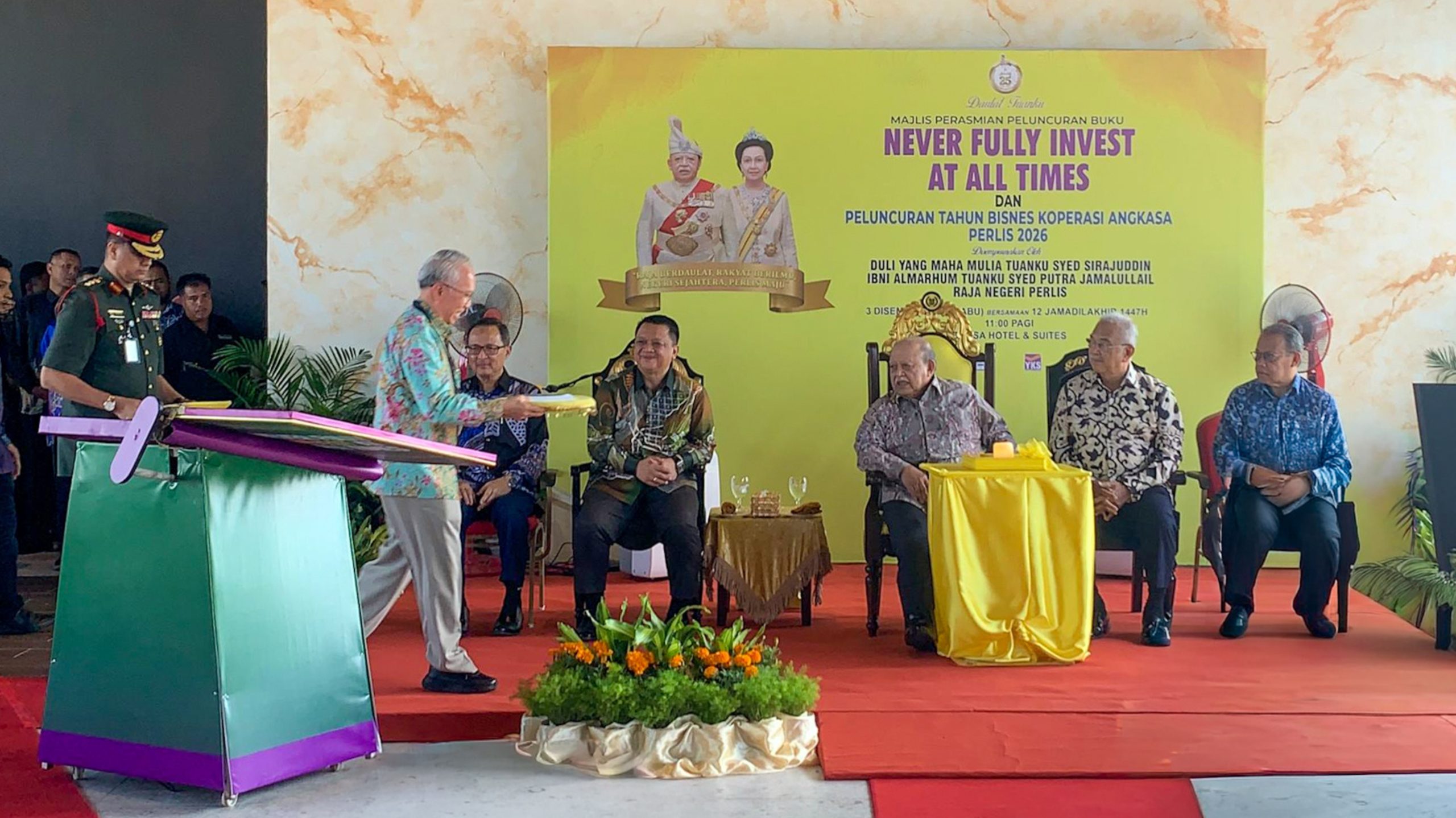 Putra Medical Centre (PMC) was honoured to attend the Book Launch Ceremony of “Never Fully Invest At All Times” as well as the 2026 ANGKASA Perlis Cooperative Business Year Launch, officiated by His Royal Highness Tuanku Syed Sirajuddin Ibni Almarhum Tuanku Syed Putra Jamalullail, the Raja of Perlis. This prestigious event was organised collaboratively by the Social Entrepreneurship Foundation (YKS), the National Entrepreneurship Institute (INSKEN), and ANGKASA Perlis, aiming to strengthen the spirit of entrepreneurship, drive innovation, and foster strategic collaboration within the local business ecosystem. The ceremony took place on Wednesday, 3 December 2025, starting at 8:45 a.m. at Elissa Hotel, Kangar.