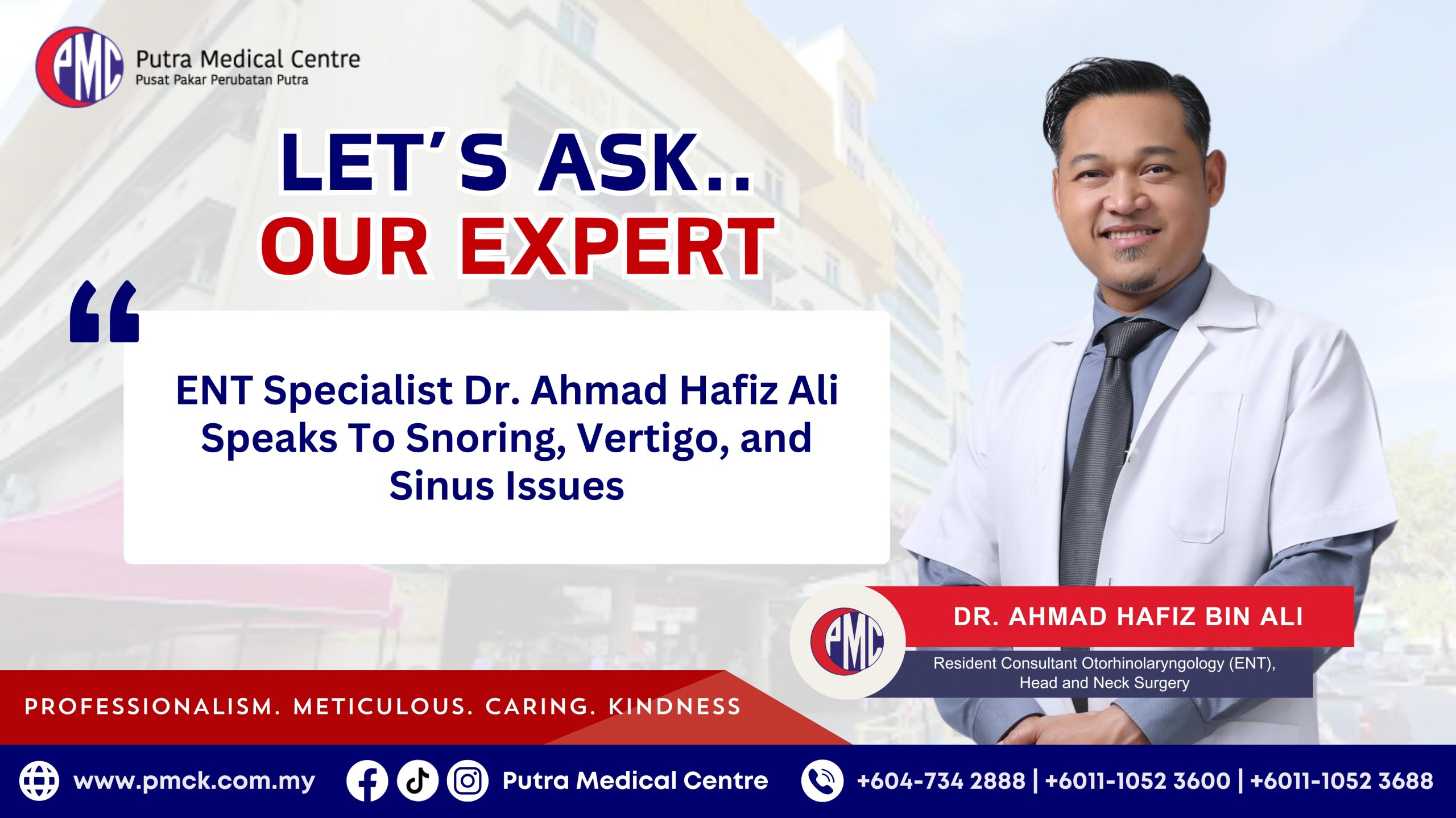 Snoring that disrupts your sleep, sinus pain that won’t go away, and dizziness that affects your safety are not just inconveniences. These are all clear signs that your body needs help. Do not ignore them. Instead, take action right away. For starters, secure an appointment with Dr. Ahmad Hafiz Ali at PMC.