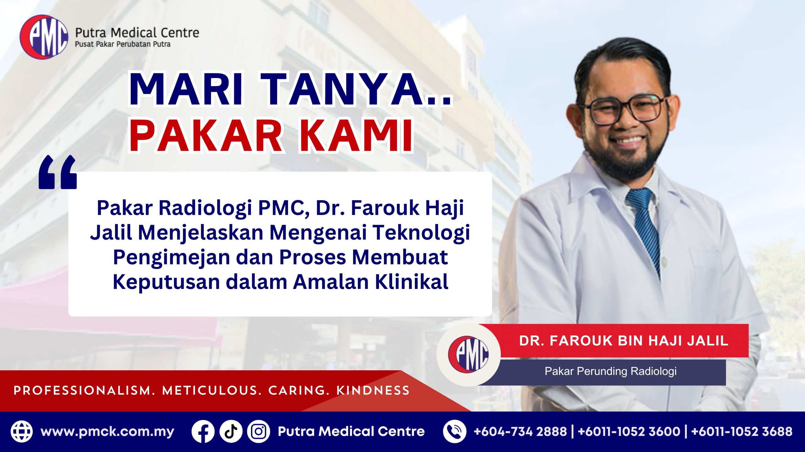 Putra Medical Centre mempunyai satu jabatan perubatan khusus yang didedikasikan untuk kemajuan radiologi dan penilaian berinformasi, yang banyak menyokong pelan pemulihan serta hasil penjagaan pesakit. Bidang ini amat menarik, terutamanya apabila teknologi digital membentuk masa depan penjagaan kesihatan, dan amat istimewa menjadi sebahagian daripada pasukan radiologi hospital ini. Kerja kami mengutamakan nyawa dan kesejahteraan pesakit,” kongsi Dr. Farouk. Beliau menambah bahawa PMC komited untuk memastikan pesakit mempunyai akses kepada rawatan terbaik.